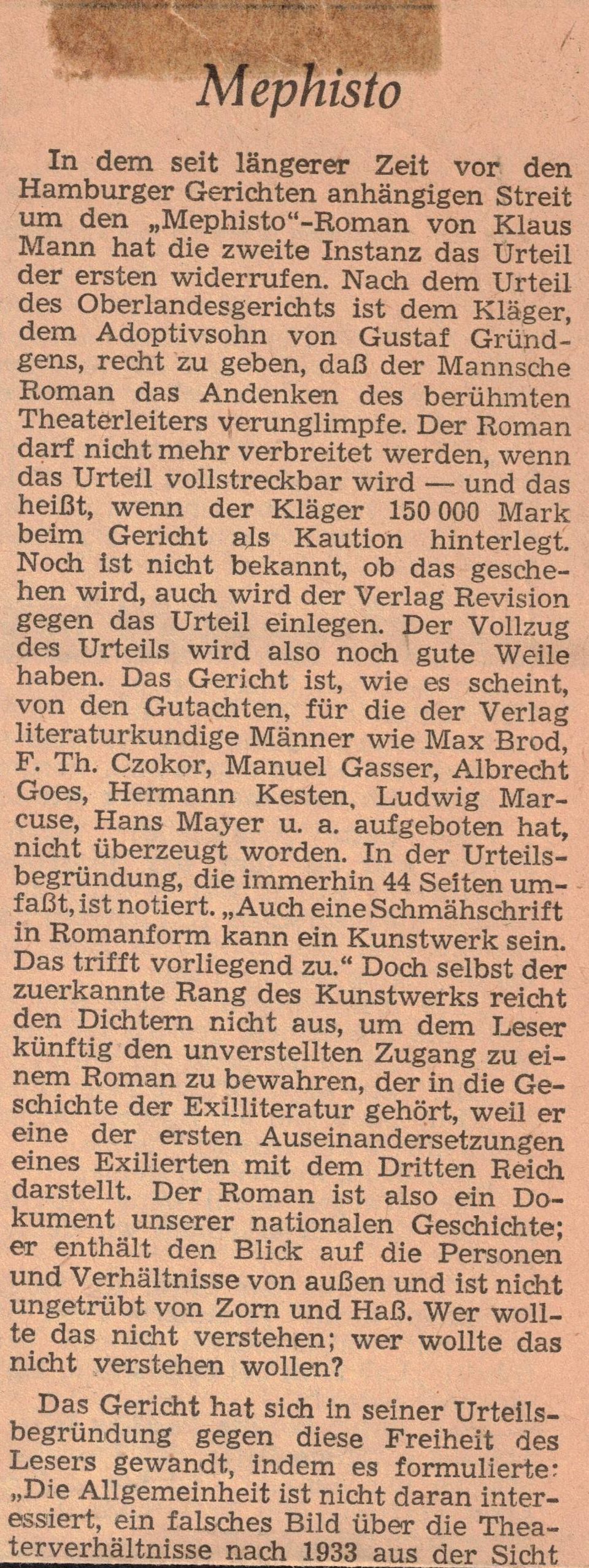 Mephisto-Entscheidung↗ an und vollstreckt ein Urteil, das sich nicht als Zensur verstanden wissen wollte, sie in seiner Konsequenz jedoch bedeutete. Fünfzehn Jahre ohne Nachdruck eines Buches voller Wut über eine durch Opportunismus ermöglichte Karriere im deutschen Faschismus: Selbstzensur des westdeutschen Verlagswesens aufgrund der realen Gefahr erneuter zivilrechtlicher Klagen.
